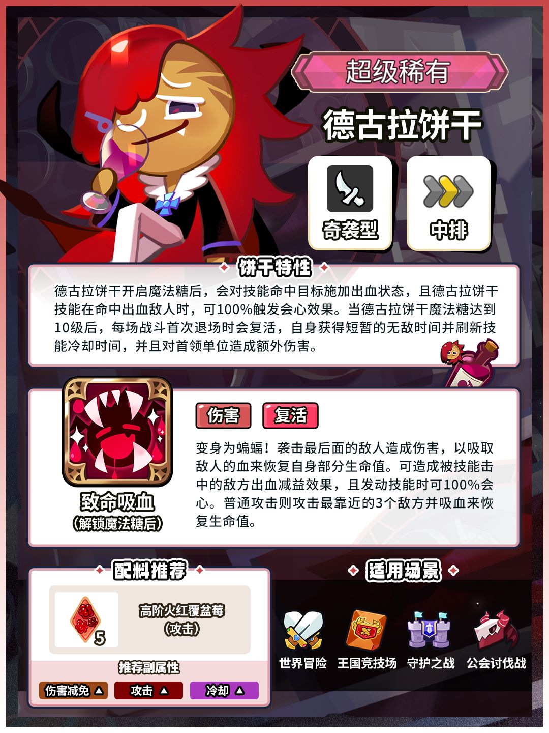 【基础信息】 角色名:德古拉饼干 所属阶级:超级稀有 饼干类型:奇袭 饼干站位:后排 CV:修缘 【配料推荐】 五个攻击 推荐理由:德古拉技能作为单体伤害,只要能确保能秒掉敌方后排就可以,因此配料选择全攻击,最大化德古拉的攻击力,确保德古拉能秒掉敌方后排。 【推荐搭档】 石榴饼干技能有攻击力加成,可以提高饼干的攻击力,让德古拉的技能更造成更多的伤害。 芒果饼干技能和石榴饼干一样,也可以为队伍其他饼