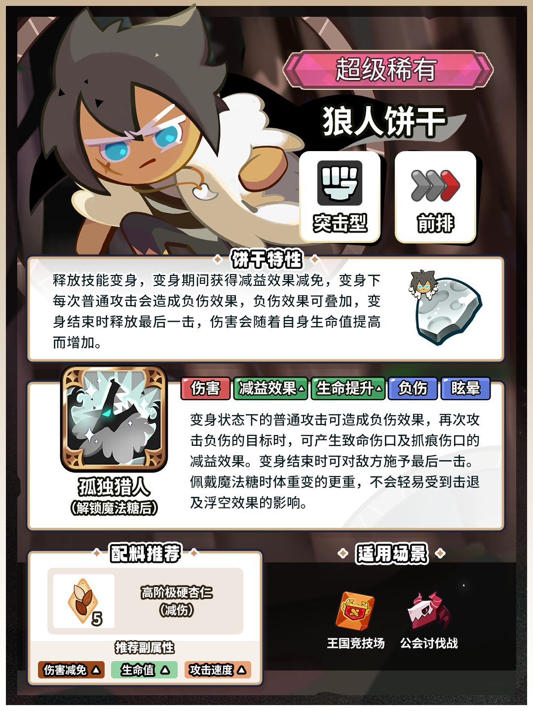 「还是很孤独。」 ✦技能特性(解锁魔法糖后) 释放技能变身,变身期间获得减益效果减免,变身下每次普通攻击会造成负伤效果,负伤效果可叠加,变身结束时释放最后一击,伤害会随着自身生命值提高而增加。 ✦关键词条:伤害、减益效果↑、生命提升↑、负伤、眩晕 ✦战斗类型:突击型 ✦作战位置:前排 ✦狼人饼干限时UP扭蛋即将开放! >>活动形式:「特别饼干扭蛋」 >>活动时间:2月26日00: