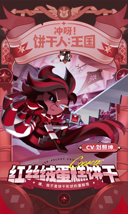 「不只是饼干,所有生命都有资格在这片土地上生活!」 CV:刘照坤 战斗类型:突击型 作战位置:前排 红丝绒蛋糕饼干用散发黑暗气息蛋糕臂制伏敌人时的狠劲,加上那对漆黑却炯炯有神的眼眸,有时看起来比蛋糕怪物还要凶狠可怕……不过,若遇到爱撒娇的蛋糕怪物,他则会放下身段,展现温柔的一面——就像丝绒般柔软又滑顺。