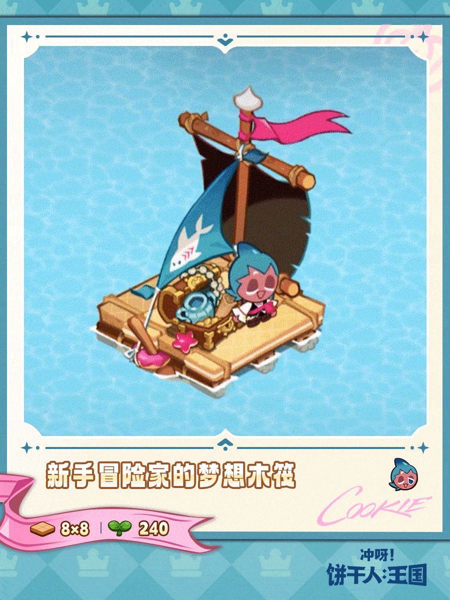 「建筑大小:8*8(水面建筑))」 「专属饼干:雪酪鲨鱼饼干」 雪酪鲨鱼饼干在新手冒险家的梦想木筏上启航,只见他时不时地用高倍望远镜眺望着海平面。对于这段激动人心的冒险,他感慨道“OooooOoooOooo!”