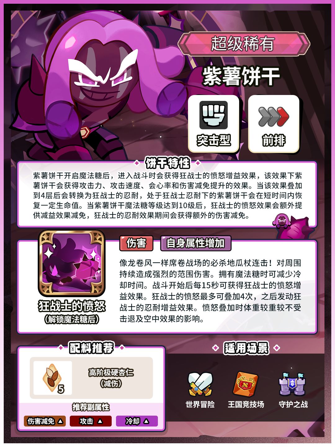 气薯了。 ✦技能特性(解锁魔法糖后) 紫薯饼干开启魔法糖后,在进入战斗时会获得「狂战士的愤怒」增益效果,该效果叠加到一定程度时,紫薯饼干会转换为「狂战士的忍耐」在短时间内恢复一定的生命值。 当紫薯饼干魔法糖等级达到10级后,「狂战士的愤怒」会额外提供效果减免、「狂战士的忍耐」效果期间会额外获得伤害减免。 ✦关键词条:伤害、自身属性增加 ✦战斗类型:突击型 ✦作战位置:前排 ✦紫薯饼干限时UP即将开