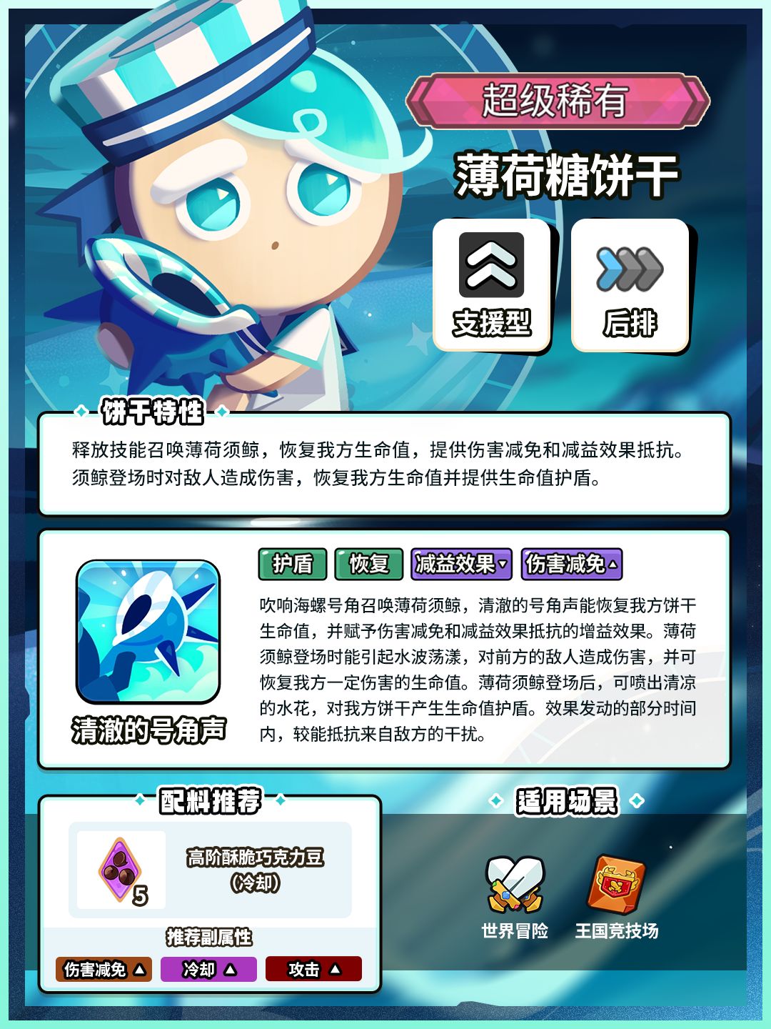 烦恼可以说给大海听,大海会包容一切。 ✦技能特性 释放技能召唤薄荷须鲸,恢复我方生命值,提供伤害减免和减益效果抵抗。须鲸登场时对敌人造成伤害,恢复我方生命值并提供生命值护盾。 ✦关键词条:恢复、护盾、减益效果降低、伤害减免提升 战斗类型:支援型 作战位置:后排 ✦薄荷糖饼干限时UP即将开放! >>活动形式:「超级稀有饼干扭蛋」 >>活动时间:4月17日00:00—5月11日23:59:59