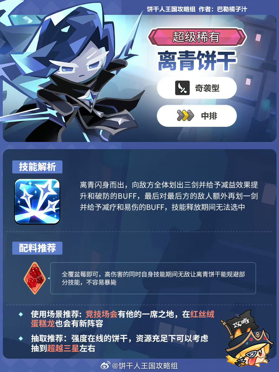 「有什么…在拨动我的记忆…」 品阶:超级稀有 战斗类型:奇袭型 不知道何时梦幻矿洞附近出现了一块冰冷的饼干,他不仅身手不凡,所到之处还会伴随着凶猛的野兽,这让想要靠近矿洞开采矿石的饼干们望而却步。然而在某一天,这块饼干却神秘地消失了,取而代之的是花都的茶馆里多了一位离青饼干。这位口袋比脸还干净的客人,此时正陪在茶舍老板身边品读绘卷,而生活中时不时会出现的阴谋诡计,也都一一消散在他凌冽的剑下。