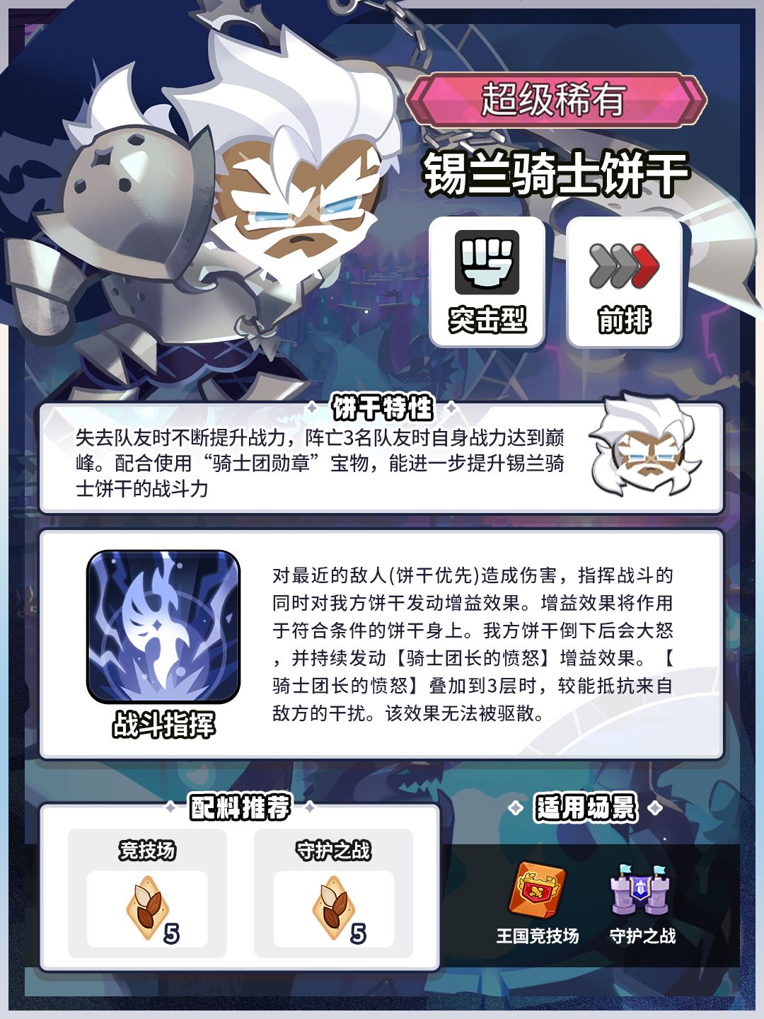 曾经征战沙场的他,如今面团酥脆依旧不减当年! ✦饼干特性 失去队友时会不断提升战斗力,战败3名队友时自身战斗力达到巅峰,配合“骑士团勋章”宝物,能进一步提升锡兰骑士饼干的战斗力! ✦战斗类型:突击型 ✦作战位置:前排