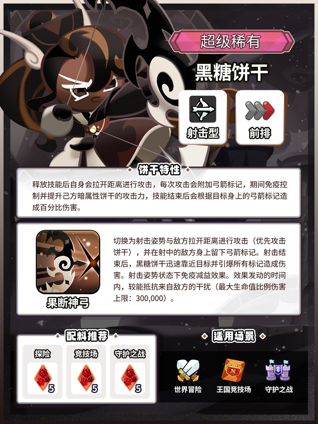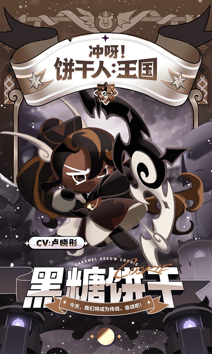 宛如苍松翠柏般可靠的护卫队长,对待百姓爱民如子,但当面对敌人时,便会展现高超的战斗技巧! ✦饼干特性 释放技能后自身会拉开距离进行攻击,每次攻击会附加弓箭标记,期间免疫控制并提升己方暗属性饼干的攻击力,技能结束后会根据目标身上的弓箭标记造成百分比伤害。 ✦战斗类型:射击型 ✦作战位置:前排 ✦全新暗元素机制将实装,暗属性饼干一览 黑可可饼干、黑巧克力饼干、黑葡萄干饼干、黑糖饼干、南瓜派饼干、红丝