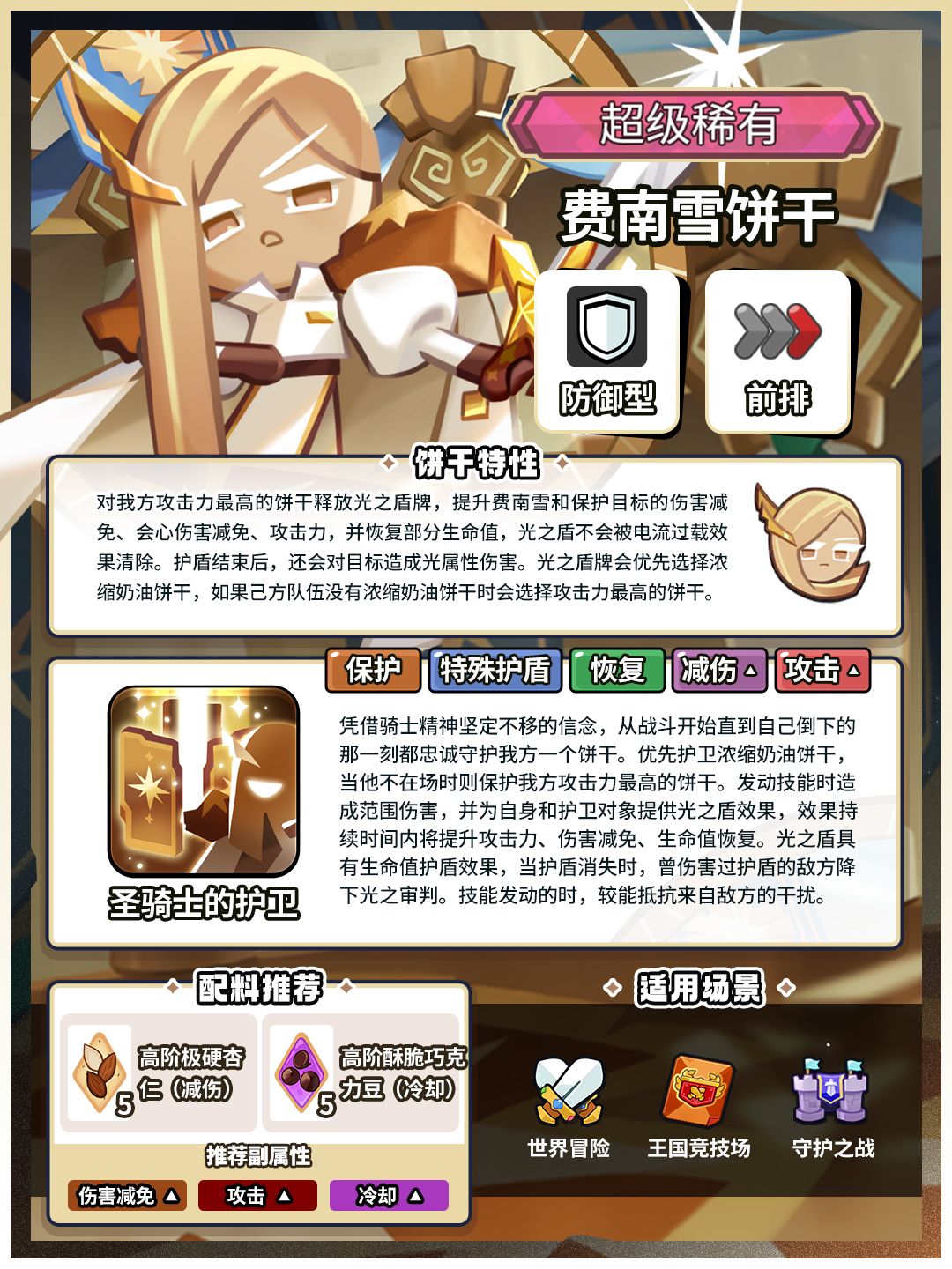 太好了是长发骑士,我们有救了! ✦饼干特性 保护我方攻击力最高的饼干(浓缩奶油饼干优先),并为之提供大量增益效果。护盾结束后,对敌方造成光属性伤害。 ✦关键词条:保护、特殊护盾、恢复、减伤、提升目标攻击。 ✦战斗类型:防御型 ✦作战位置:前排 ✦费南雪饼干限时UP即将开放! >>活动形式:「超级稀有饼干扭蛋」 >>活动时间:11月14日更新后—12月1日23:59:59