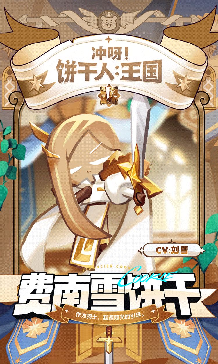 战斗类型:防御型 作战位置:前排 CV:刘雪 无论是举起双手祈祷的端正姿势或是将剑插入剑鞘的利落动作,费南雪饼干都有如骑士教科书等级般完美……他烫得笔直的制服上从不带有饼干屑。不过,可不要误会他是一个冷酷无情的饼干,只有王国挨饿受冻的饼干们才知道费南雪饼干充满温暖的那一面! ✦费南雪饼干限时UP即将开放! >>活动形式:「超级稀有饼干扭蛋」 >>活动时间:11月14日更新后—12月1日23