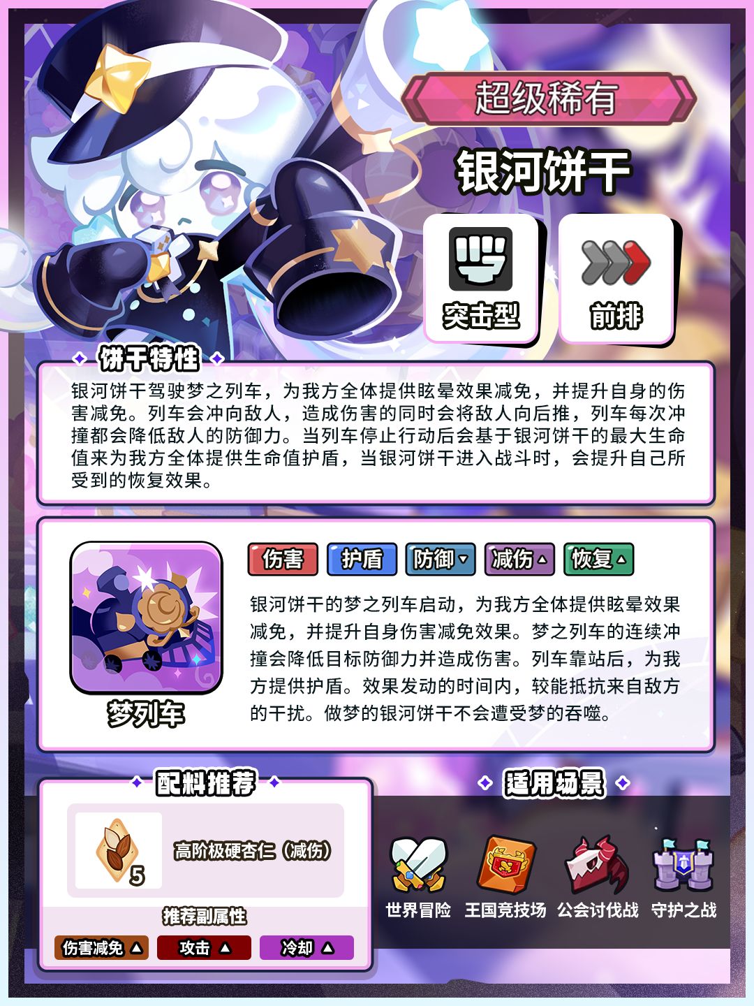 「噗噗~梦之列车启动!」 ✦技能特性 银河饼干驾驶梦之列车,为我方全体提供眩晕效果减免,并提升自身的伤害减免。列车会冲向敌人,造成伤害的同时会将敌人向后推,列车每次冲撞都会降低敌人的防御力。当列车停止行动后会基于银河饼干的最大生命值来为我方全体提供生命值护盾,当银河饼干进入战斗时,会提升自己所受到的恢复效果。 ✦关键词条:伤害、护盾、防御↓、减伤↑、恢复↑ ✦战斗类型:突击型 ✦作战位置:前排 ✦