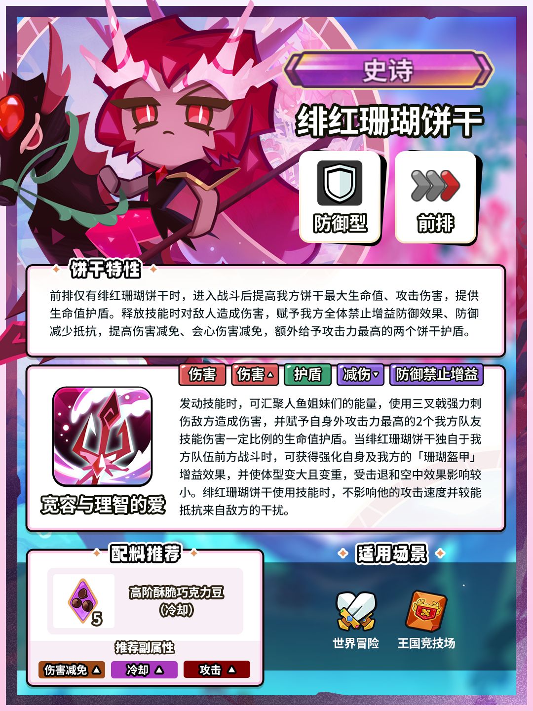 只要大家平安无事就好。 ✦技能特性 前排仅有绯红珊瑚饼干时,进入战斗后提高我方饼干最大生命值、攻击伤害,提供生命值护盾。释放技能时对敌人造成伤害,赋予我方全体禁止增益防御效果、防御减少抵抗,提高伤害减免、会心伤害减免,额外给予攻击力最高的两个饼干护盾。 ✦关键词条:伤害、伤害提升、护盾、伤害减免提升、防御禁止增益 战斗类型:防御型 作战位置:前排 ✦绯红珊瑚饼干限时UP即将开放! >>活动形式
