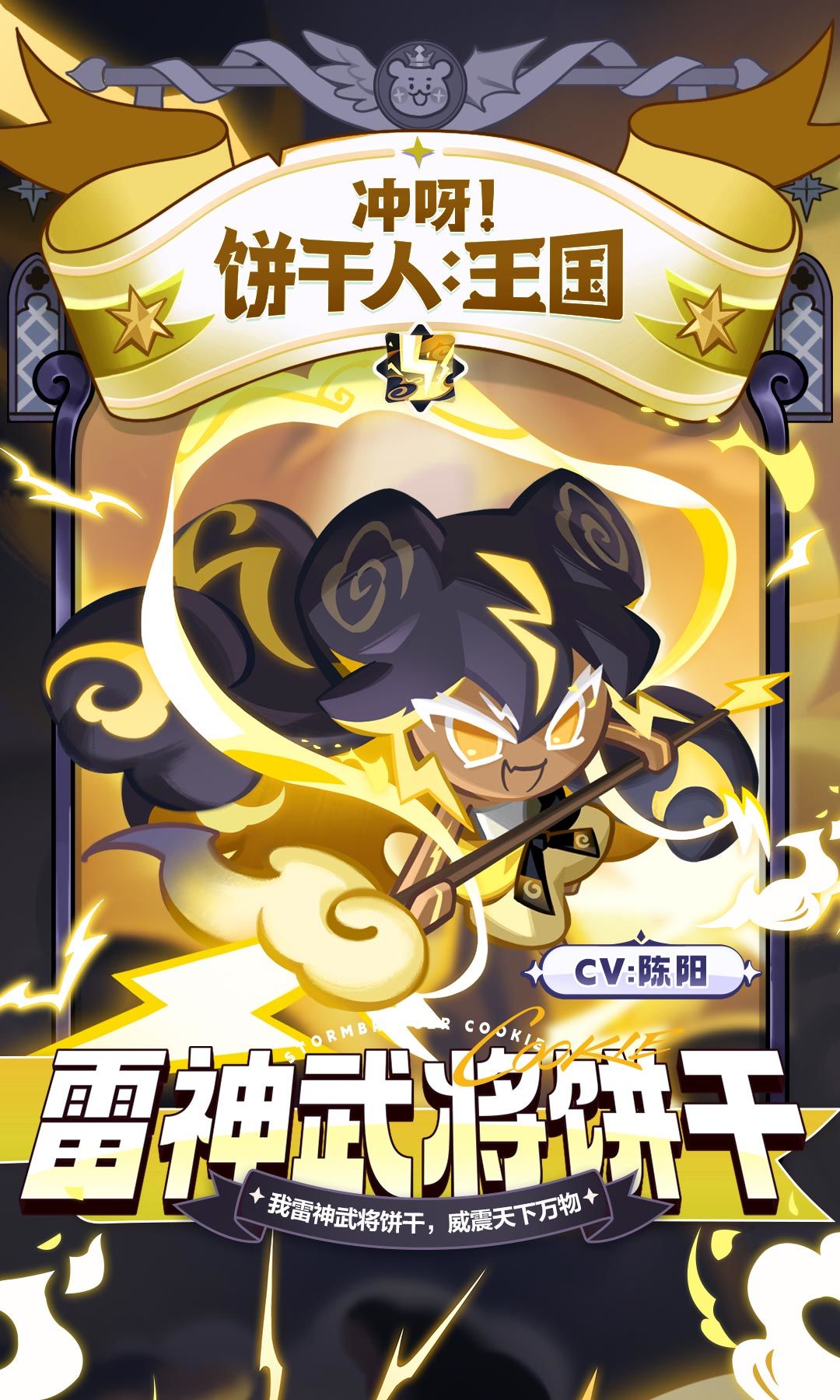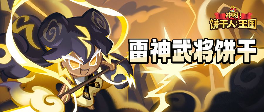 「雷神武将饼干」即将登场! 品阶:传奇 战斗类型:突击型 作战位置:前排 总是独自统御天空的雷神武将饼干,在搜集了空中的生命粉末后,创造出掌管雨、风、云的手下,依循自然法则使得生命粉末持续循环...虽然看见他常常慵懒地躺在云上,要饼干们送上糖云的模样,不禁会怀疑他真的是神吗?不过只要有小看上天者出现,他就会挥舞着雷电偃月刀降下天谴,这下谁还敢挑战上天呢?当你仰望上天许愿时可千万要小心,若心中有一丁