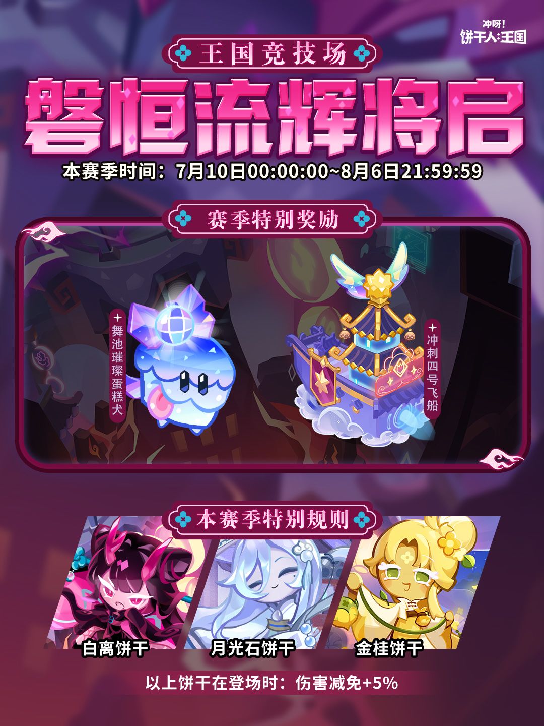 饼干朋友们,「闪电赛季」将于7月9日(今晚)23:59:59后结束,届时王国竞技场将于7月9日22:00:00后进行赛季结算,「闪电赛季王国通行证」也将于7月9日23:59:59后结束,还请各位做好规划,把握时间进行最后的冲刺~ 在此之后,全新竞技场「磐恒流辉赛季」也将开放,参与挑战,有机会获得赛季特别奖励舞池璀璨蛋糕犬、赛季专属装饰冲刺四号飞船!全新赛季将至,开启新一轮的攀登吧! ✦磐恒流辉