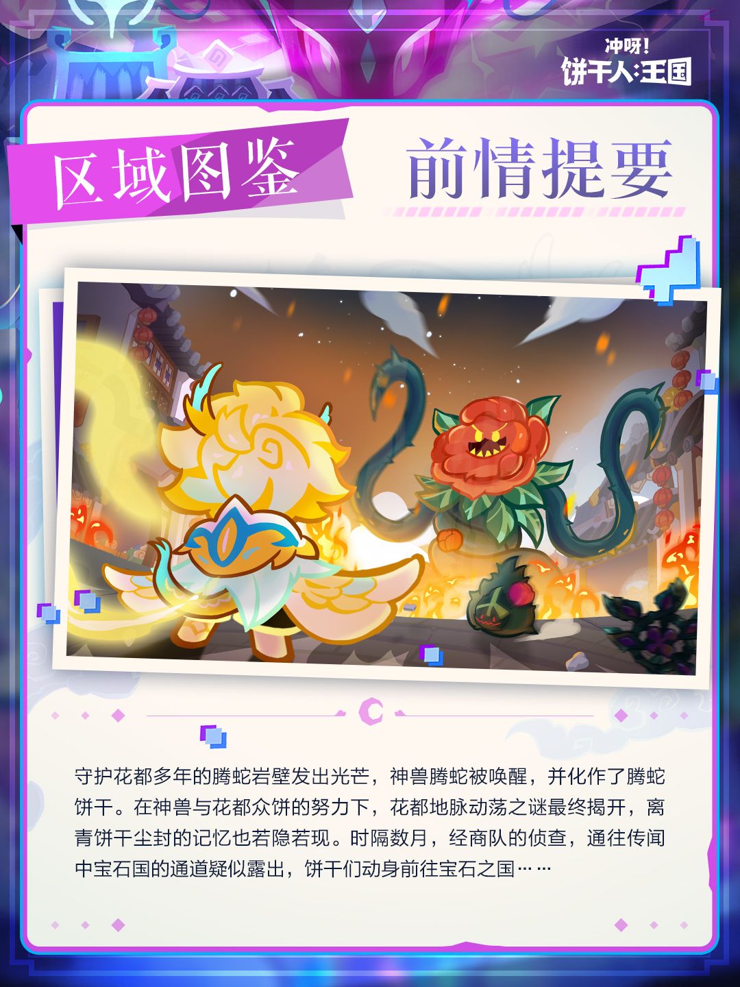 宝石国的饼干一直以为自己是蓬松米糕大陆仅有的幸存饼干,直到来自花都的饼干们踏入这里…… 伴随着国风冒险即将正式开启,7月3日也将开启「花都饼干限时返场卡池」饼干朋友们将有较大概率邂逅“腾蛇饼干、山茶花饼干、金桂饼干、丹桂饼干、离青饼干”,共同步入“遗世的宝石王国!”