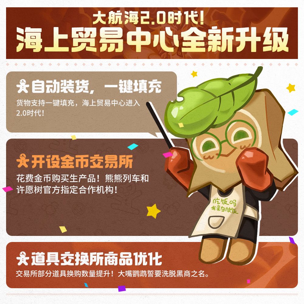 菜饼从本次开发组罗列的众多“调优小作文”中,摘出了大家所关心的几大优化内容,更为详细的版本调优一览清单,还请大家查看相关公告~ >>全面升级的贸易中心 贸易中心现进入2.0时代,支持金币换购道具、码头一键填充啦~ >>散发光芒的英雄神殿 现在神殿开启栏位无需花费材料,往期花费材料全额返还。同类型饼干登录神殿时,技能等级可同步成该类型技能等级最高的5个饼干;吸收英雄气息后石像变得更为耀眼,现蕴藏英雄