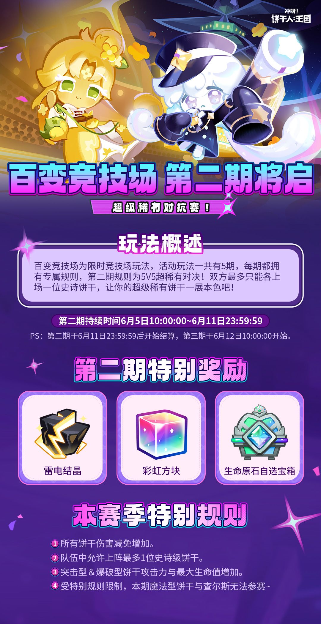百变竞技场共有5期,每一期将有不同的专属规则,本期百变竞技场规则为“超级稀有饼干对决”,玩家最多可在队伍中配置1位史诗级饼干,余下仅能上阵超级稀有饼干,受“特别”规则影响,本期魔法型饼干与查尔斯无法参赛~ ✦活动时间 6月5日10:00:00-6月11日23:59:59 ✦主要奖励 彩虹方块、雷电结晶、生命原石自选宝箱