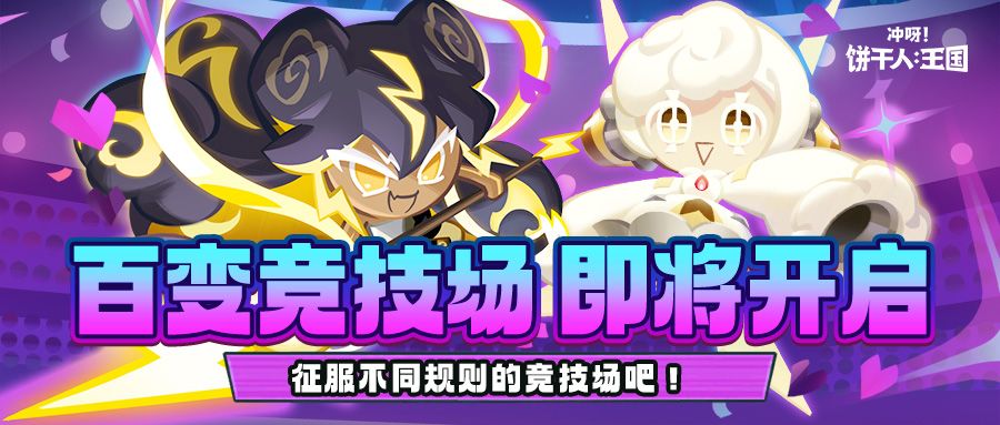 「百变竞技场」为充满趣味的竞技场对战玩法! 活动共有5期,每一期将有不同的专属规则,首期百变竞技场规则为无限制对决,出战饼干数量可达到7个,且不限制上阵的上古/传奇/龙族饼干数量。参与挑战可以获得雷电结晶、生命原石自选宝箱等丰厚奖励! ✦活动时间 5月29日更新后-7月2日23:59:59 ✦主要奖励 水晶、彩虹方块、巧克力粉片、雷电结晶
