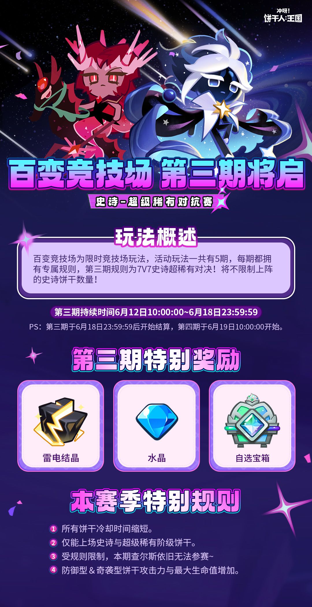 百变竞技场共有5期,每一期将有不同的专属规则,本期百变竞技场规则为史诗-超级稀有对决,饼干朋友们上阵的史诗饼干数量将没有限制,且所有饼干技能冷却时间缩短~(ps:受“特别”规则影响,本期查尔斯依然无法参赛) ✦活动时间 6月12日10:00:00-6月18日23:59:59 ✦主要奖励 水晶、雷电结晶、自选宝箱