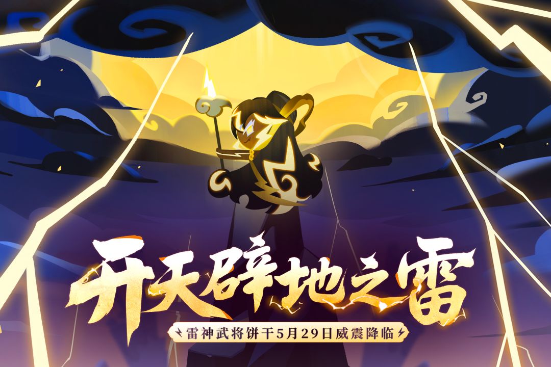 在那个云雾缭绕的天空上,藏着一个能够开天辟地的神器。 那就是用天地初开的第一道雷所制成的“雷电偃月刀”。 据说这把刀砍向天际后, 从此天空便一分为二,产生了昼与夜... 关于它的故事,至今仍随着微风浮云流传下去。 全新版本「开天辟地之雷」将于5月29日开启,百变竞技场趣味打响!全新突击型「传奇」雷神武将饼干威震降临,签到七日免费领取! 更有爆破型「超级稀有」布丁百汇饼干、奇袭型「超级稀有」巧克力淋