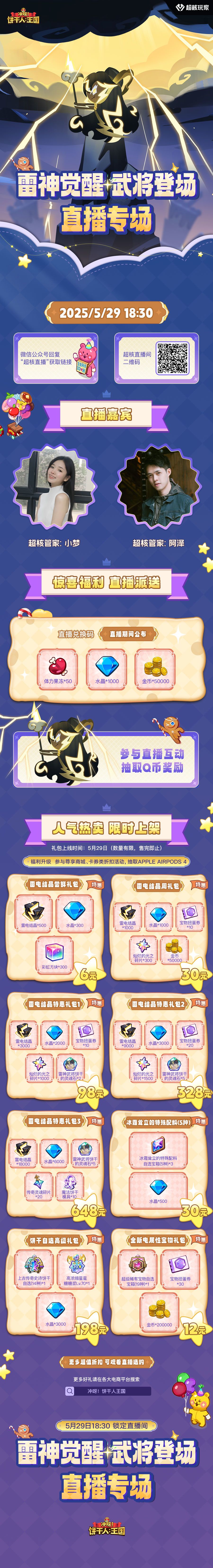 超值折扣、惊喜福利,通通备好,快来呼唤饼搭子速来围观!直播期间掉落全服兑换码、Q币等福利,更有超值折扣礼包售卖,限时特价礼包上架开售~ ✦直播时间: 5月29日 18:30 ✦直播入口: 1、冲呀饼干人王国官方公众账号回复“超核直播”即可获取直播链接 2、扫描下方长图中二维码进入