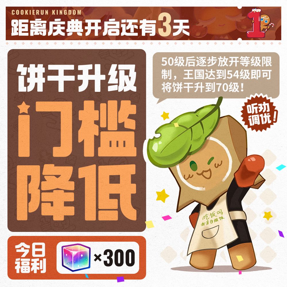 全新周年庆版本开启后,将开放王国等级、饼干等级、饼干技能等级70级上限,与此同时,饼干升级门槛将大大降低——王国等级50级后逐步开放饼干等级限制,当达到54级后即可将饼干等级、饼干技能等级升到70级! 「今日福利:彩虹方块*300」已通过邮件发放,请饼干朋友们查收~ 更多听劝调优内容,请见后续爆料!