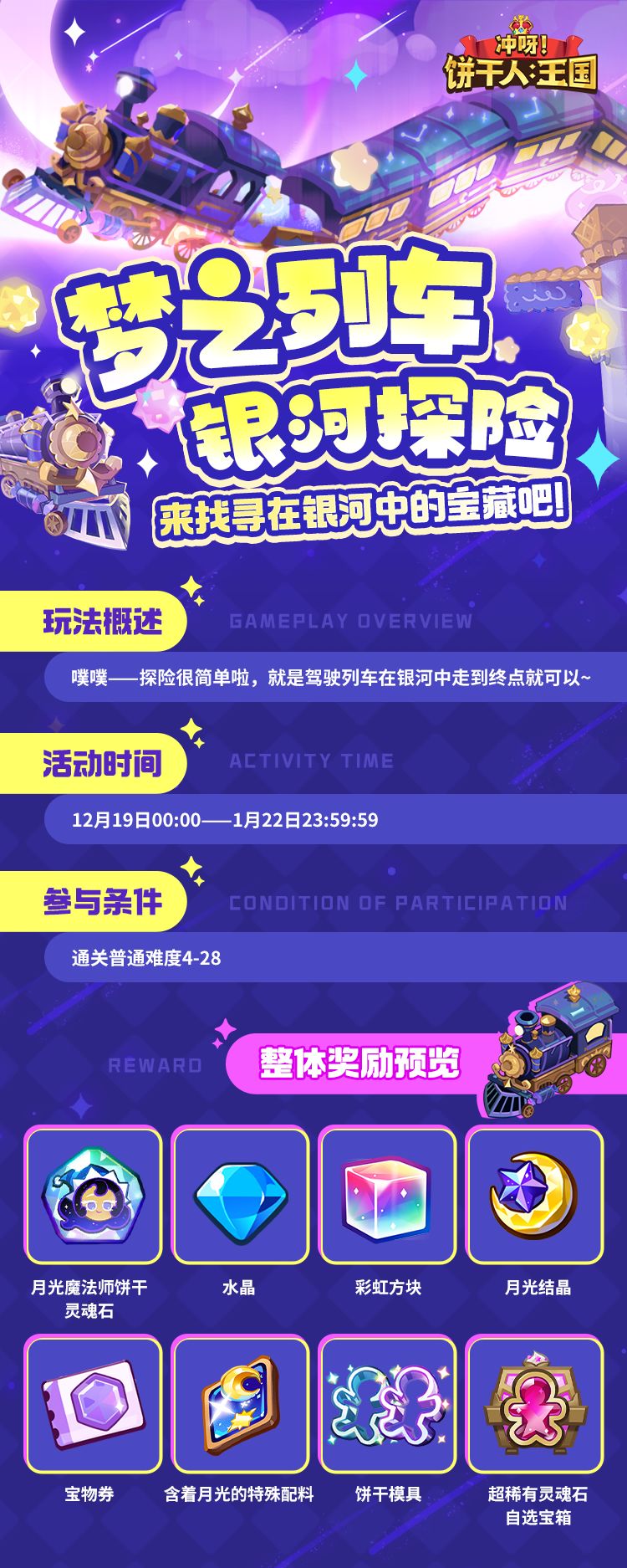 ✦活动说明 噗噗——探险很简单啦,驾驶列车在银河中走到终点就可以~ (更多玩法介绍,欢迎点击图片查看详情!) ✦活动时间 12月19日更新后——1月22日23:59:59 ✦Rogue玩法全面优化 在上次黑珍珠群岛Rogue玩法后,我们汲取了大量饼干朋友们的意见并做出调优,本次梦之列车主题Rogue玩法将焕新登场—— 1、地图长度缩短:降低饼干朋友的肝度; 2、新增黄金地图保底:通过使用保底结晶,