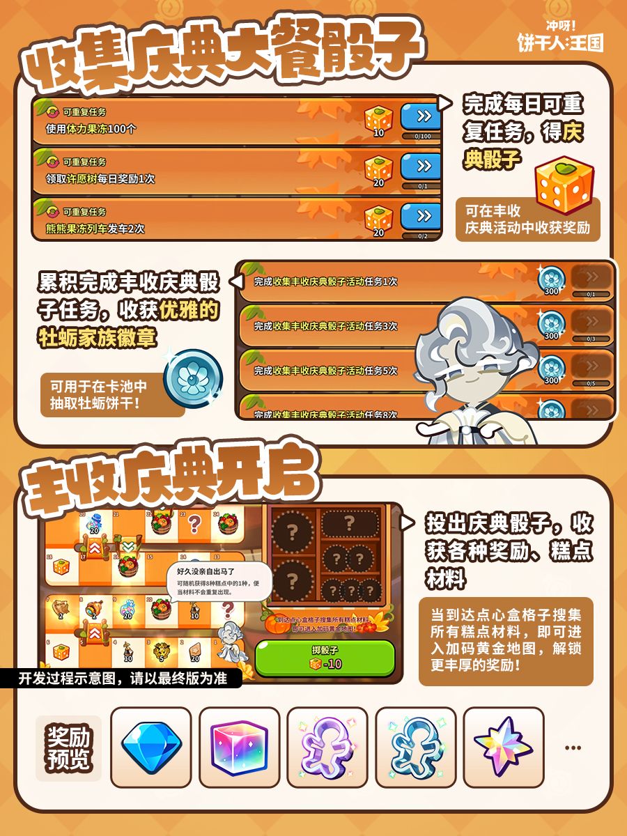 「华丽的庆典迎来了最高潮,徐徐走来的身姿是……?」 ✦开放时间: 11月28日00:00——12月11日23:59:59 ✦收集庆典大餐骰子 鲜奶油联邦举行了丰收庆典,完成任务获取骰子,累计完成收获骰子任务,可获得「牡蛎家族徽章」(牡蛎饼干抽卡代币)。 ✦丰收庆典开启 投出请庆典骰子,收获各种奖励、糕点材料(当到达点心盒格子搜集所有糕点材料,即可进入加码黄金地图,解锁更丰厚的奖励!)
