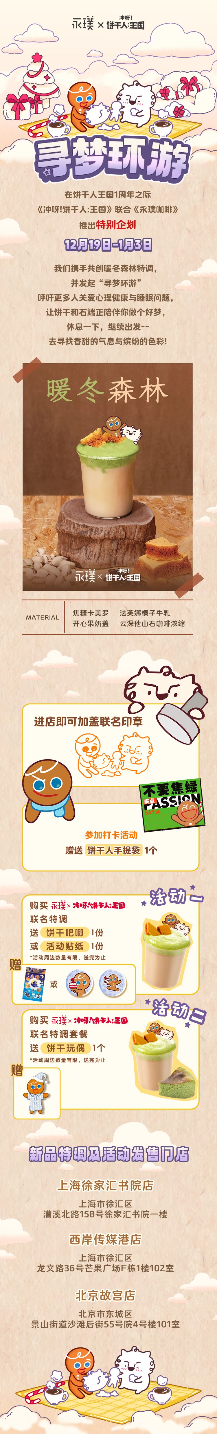 在1周年之际,《冲呀!饼干人:王国》联合《永璞咖啡》推出特别企划! 不仅有饼干联名「暖冬森林特调」、线下专属的主题门店装扮,也将有「寻梦环游」企划特别周边等你领取——让饼干和石端正陪伴你做个好梦~