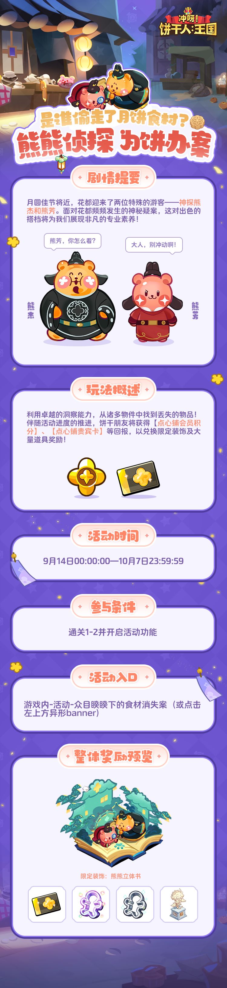 「熊芳,你怎么看?」 「——大人,别冲动啊!」 ✦玩法介绍 体验特别的剧情,在不同关卡中利用卓越的洞察能力,找到丢失的物品,收获限定装饰及大量道具奖励吧! ✦活动时间: 9月14日00:00:00——10月7日23:59:59 ✦奖励预览: 特别装饰「熊熊立体书」、饼干模具、点心铺贵宾卡(可在精致点心铺兑换更多奖励)。