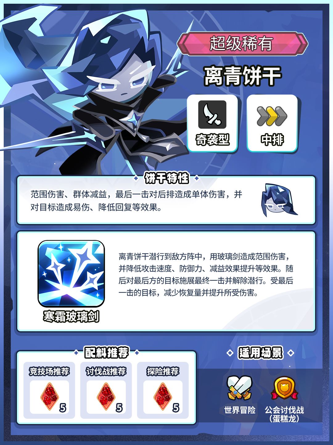 虽然离青饼干忘记了许多事情,但当这块身份成谜的饼干挥舞起玻璃剑,不要小觑这其中的威力! ✦饼干特性 范围伤害、群体减益,最后一击对后排造成单体伤害,并对目标造成易伤、降低回复等效果。 ✦战斗类型:奇袭型 ✦作战位置:中排