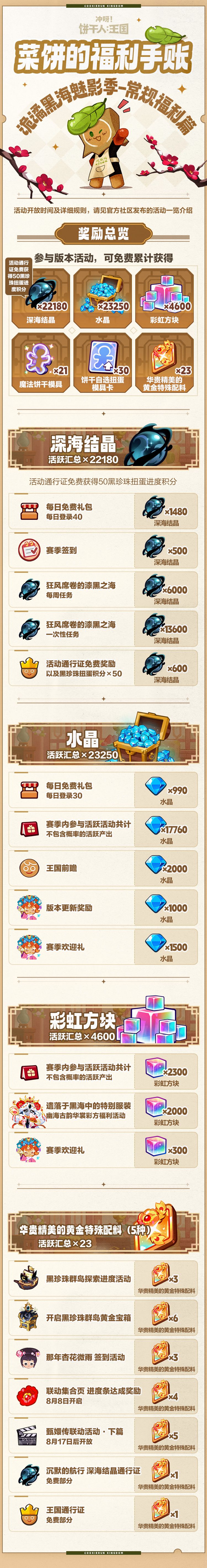 伴随着黑海冒险的启程,「深海宫廷狂欢季」已正式拉开帷幕! 作为包含“诡谲黑海魅影”与“甄嬛传联动”大量全新内容的版本,自然也少不了为饼干朋友们准备的福利,伴随着这份福利手账,将赛季福利揽入囊中吧! (该手账仅统计「诡谲黑海魅影」主题相关的内容,更多《甄嬛传》联动内容相关福利,请期待菜饼后续的福利手账&福利日历!)