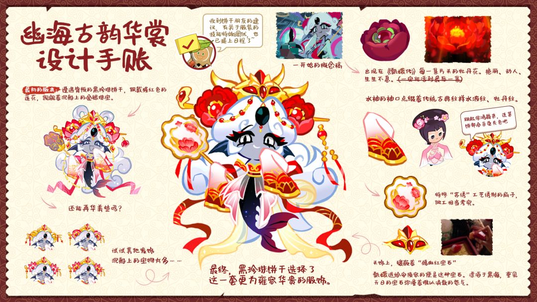 雍容华贵的宫廷装扮?实际上是“饼斗冠军装”…… 另外饼干朋友们的建议已经收到!有关于服装的技能特效调优,也已提上日程了~ ✦幽海古韵华裳研发美术日志: