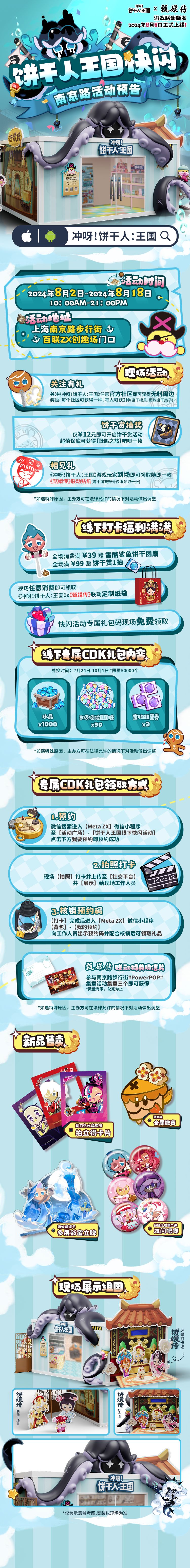 ✦活动时间: 2024年8月2日——8月18日,每天10:00至21:00 ✦活动地点: 上海市黄浦区上海南京路步行街 ZX创趣场门口 ✦活动规则 1. 预约方式: 微信搜索进入【Meta ZX】微信小程序,至【活动广场】-【饼干人王国线下快闪活动】,点击下方我要预约即预约成功 2.预约规则: 每个账号仅可预约一次,预约成功后无法取消,预约码在活动时间内均可使用 预约时间:2024年7月27日起 3