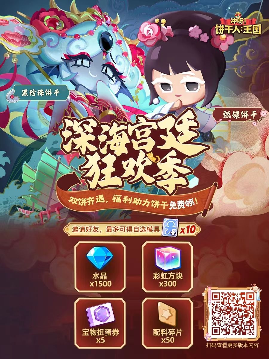 探索神秘的深海,穿越华美的宫廷,深海宫廷狂欢季预约活动开启! 参与【深海宫廷狂欢季预约活动】,完成预约即可获得水晶×1500、彩虹方块×300、宝物扭蛋券×5、配料碎片×50,此外,每邀请1名新玩家或回归玩家,即可获得【饼干自选扭蛋模具卡】×2,最高获取5次,可累计获得【饼干自选扭蛋模具卡】×10! ✦活动时间:7月24日10:00-9月4日23:59 ✦「深海宫廷狂欢季」版本预约站,饼干朋友们通