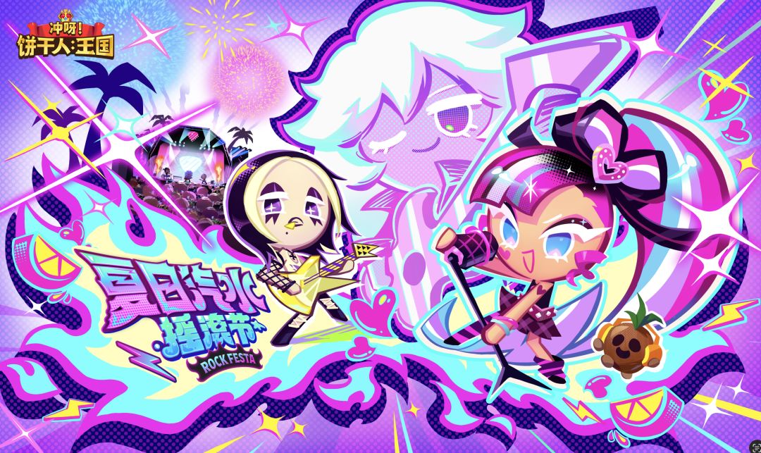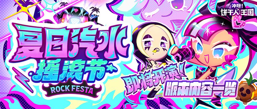 果酱沸腾,酥脆震荡! 「夏日汽水摇滚节」将于6月27日正式开启,全新史诗饼干「闪耀之星饼干」即将实装、超级稀有饼干「摇滚巨星饼干」也将登场!更有特别区域故事、夏日汽水摇滚节表演季活动来袭,准备活动好面团,与饼干们一起奔赴这场夏日的派对!