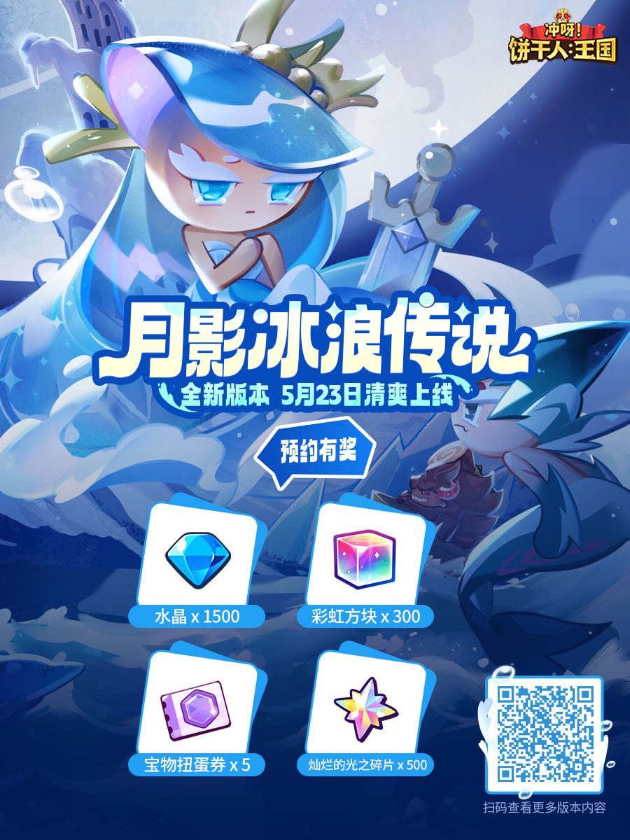 「无论我身在何处,你总是照耀着我...」 「为什么今晚却把我独自留在黑暗中呢?」 「月影冰浪传说」将于5月23日正式开启,全新传奇饼干「海妖精饼干」、超级稀有饼干「雪酪鲨鱼饼干」将至。全新「冰浪之塔」挑战活动来袭——倾听海浪的呢喃,揭开月食之夜的传说! ✦「月影冰浪传说」版本情报站现已正式解禁↓ ✦版本预约奖励(记得前往版本情报站预约哦) 水晶x1500、彩虹方块x300、宝物扭蛋券x5、灿烂的光