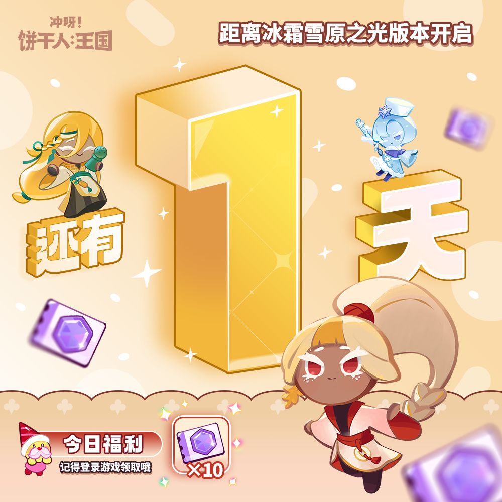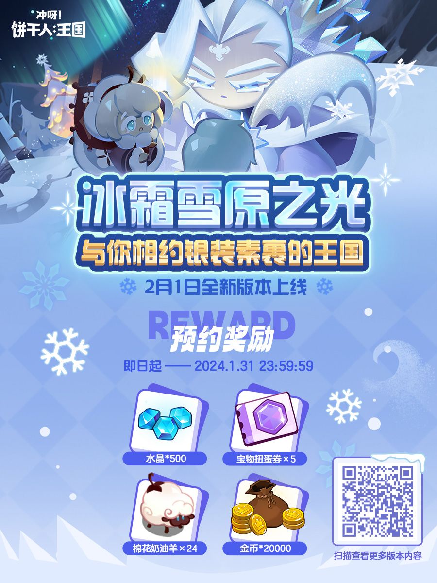 凛冬将至,探寻寒风积雪中温暖的灯火! 全新传奇饼干「冰霜女王饼干」登场、全新「新春守岁」系列服装实装,还有旺旺联动新饼、联动装饰参与活动「免费兑换」,更多版本福利等你领取 ——循着棉花饼干的灯光,一起探寻银装素裹的饼干王国吧~ ✦冰霜雪原之光版本情报站现已正式解禁 为了帮助各位饼干朋友迎接全新篇章,糖糖地精也为各位准备了丰厚的补给,请各位一览~(详细的领取方式与时间,还请至版本情报站进行查阅。)