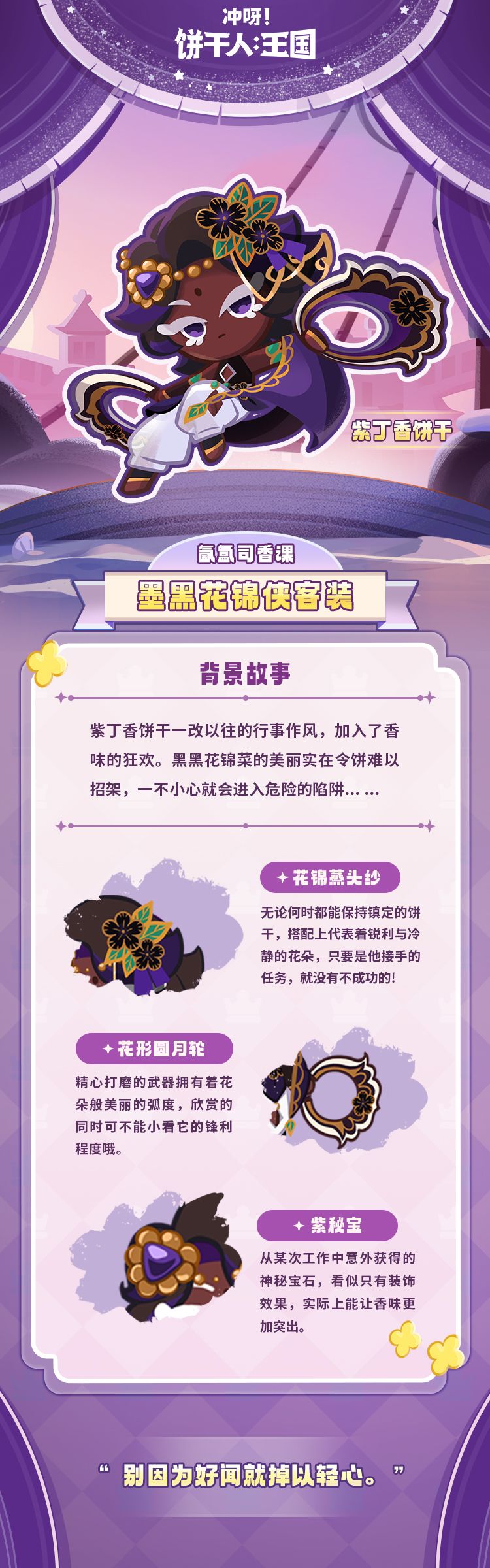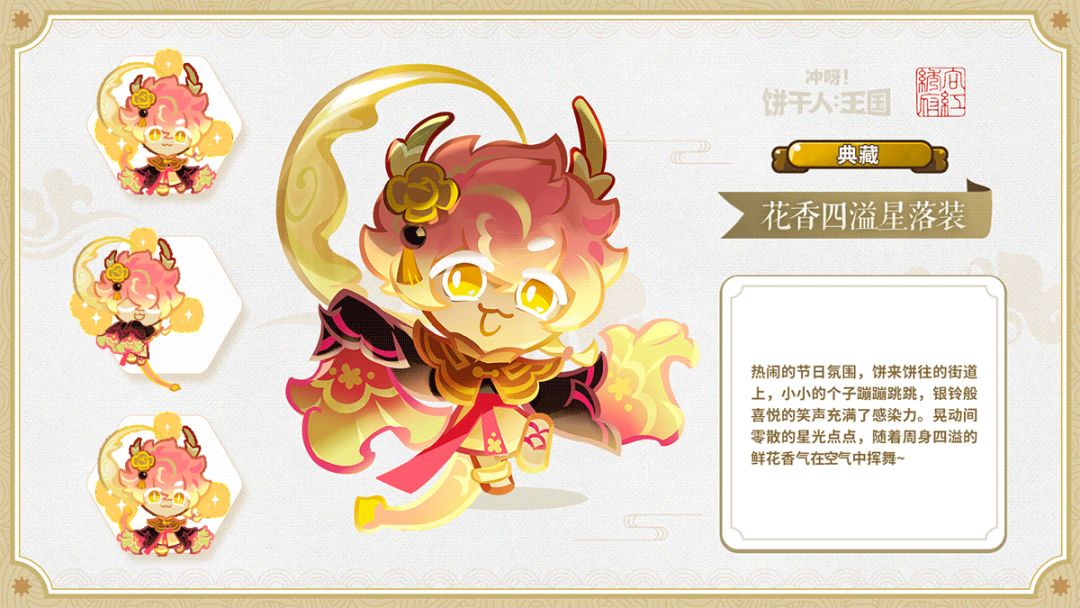 远道而来的金桂饼干受邀在王国开设了调香课程! 课堂之上,金桂饼干为每块饼干选择了不同的花作为制香素材,熏香点燃后,饼干们在幻境中看见了自己理想中的未来,直到一个神秘的红色身影混入了课堂…… 全新典藏服装「氤氲司香课」国风特别活动将于1月5日(8:00)正式开启! ✦活动时间:1月5日08:00:00~1月24日23:59:59 ✦开启条件:通关冒险2-13,并完成蒙布朗饼干发布的任务 在香气的指引