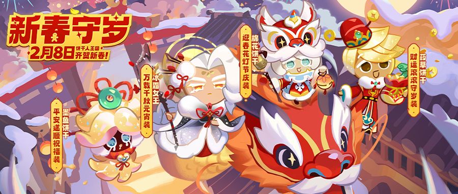 节庆的气氛融化了冰霜,灯火通明的新年夜,饼干们都换上了新服装! 遥遥望去,远处走来的那块边走边掉金币的饼干是……? 全新典藏服装「新春守岁」特别活动将于2月8日(8:00)正式开放! ✦活动时间:2月8日08:00:00~2月28日23:59:59 ✦开启条件:通关冒险2-13,并完成蒙布朗饼干发布的任务 相约饼干王国,共赴甜蜜酥脆的新年!