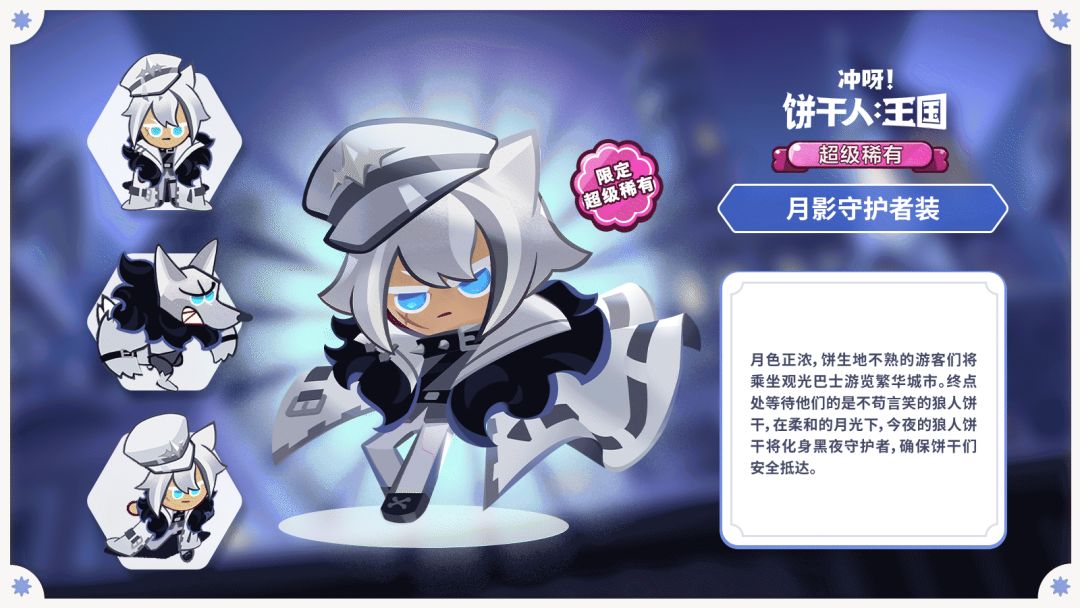 听说这块饼干姐姐去王国的时候曾见到过,当时他还被拉去上了调香课,看在这份上,就帮你再宣传一下吧~ 3月23日10:00:00后,参与「来进行城市观光吧!」活动,达到终点即可获得狼人饼干限定超级稀有服装【月影守护者装】! 活动介绍: