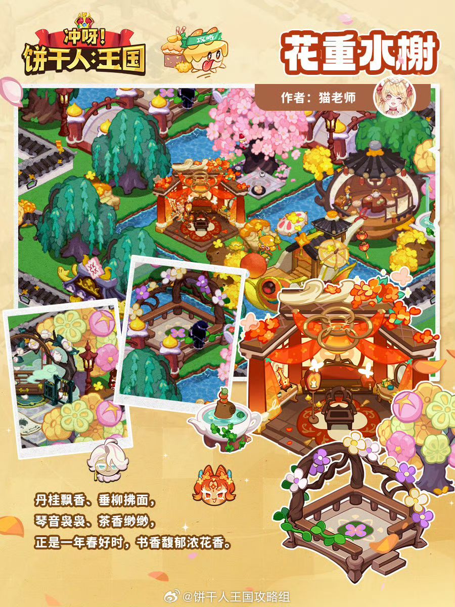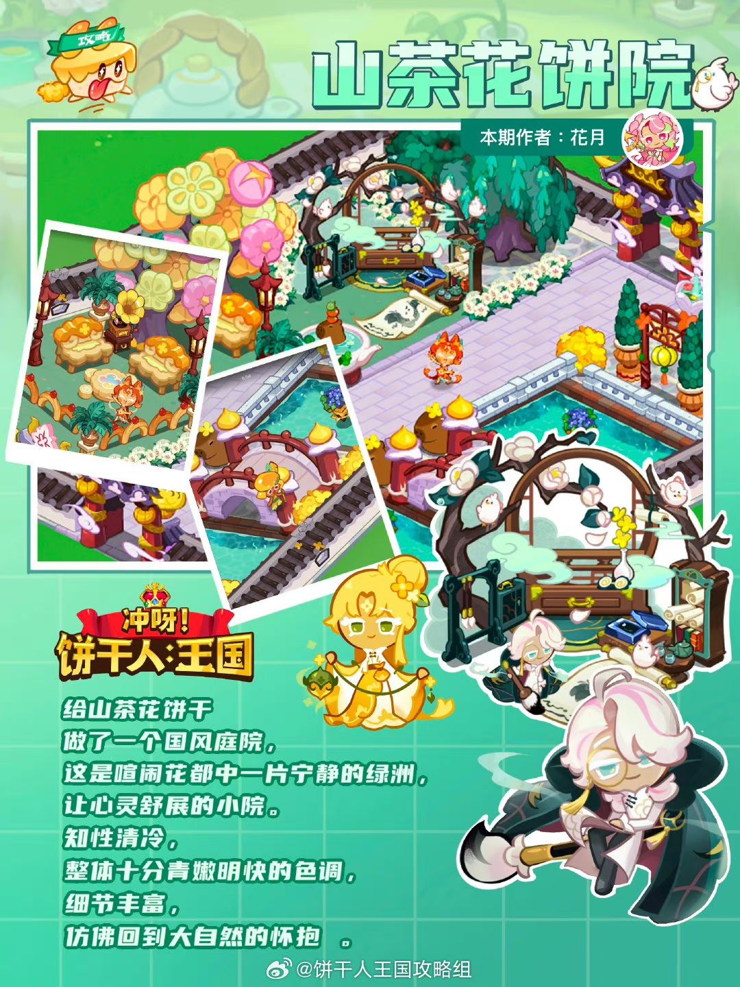 给山茶花饼干做了一个国风庭院,这是喧闹花都中一片宁静的绿洲,让心灵舒展的小院。知性清冷,整体十分青嫩明快的色调,细节丰富,仿佛回到大自然的怀抱 。 作者@花月沾衣 设计@不柿本人KAKI