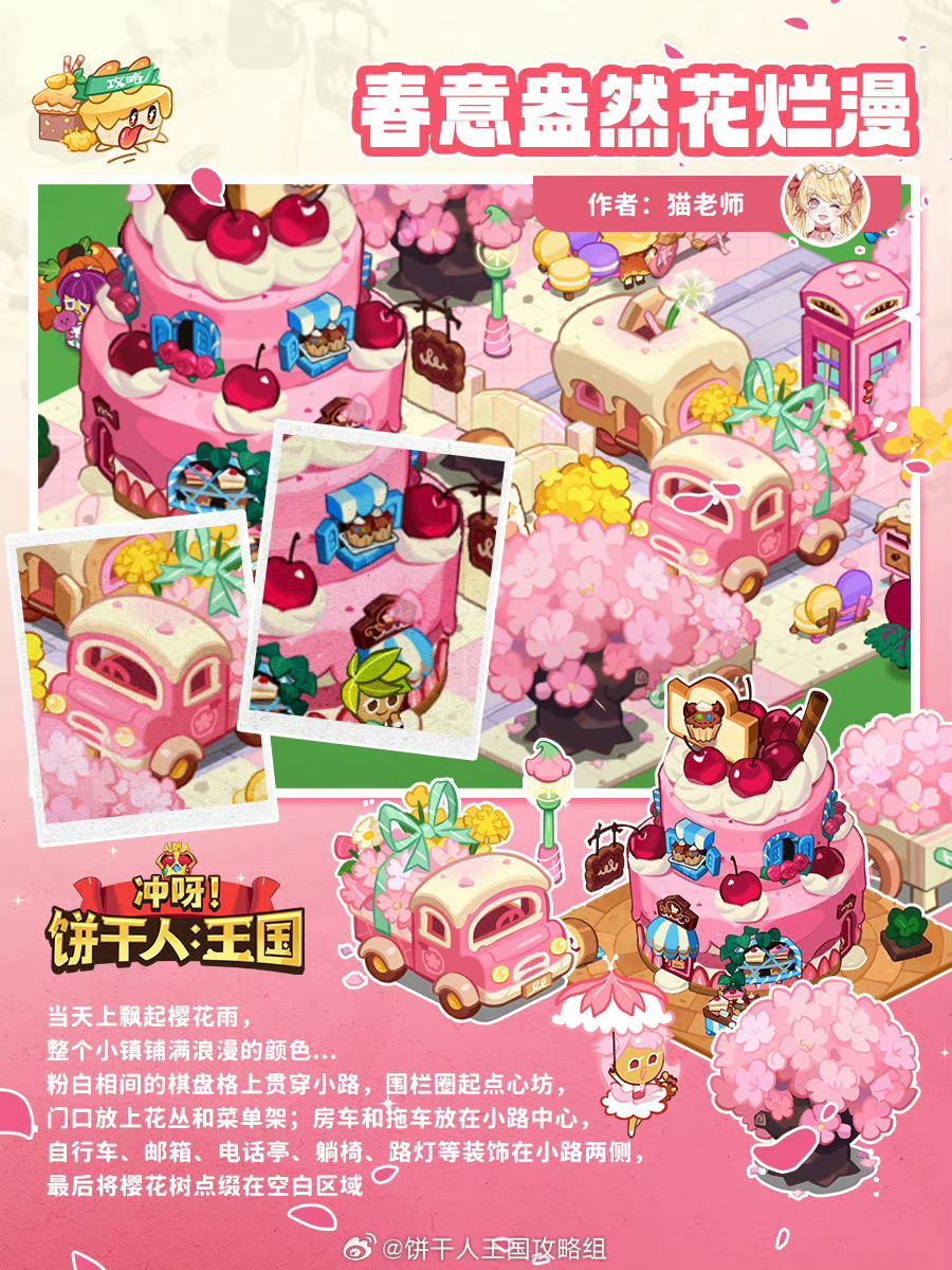 当天上飘起樱花雨,整个小镇铺满浪漫的颜色...粉白相间的棋盘格上贯穿小路,围栏圈起点心坊,门口放上花丛和菜单架;房车和拖车放在小路中心,自行车、邮箱、电话亭、躺椅、路灯等装饰在小路两侧,最后将樱花树点缀在空白区域 作者:猫老师