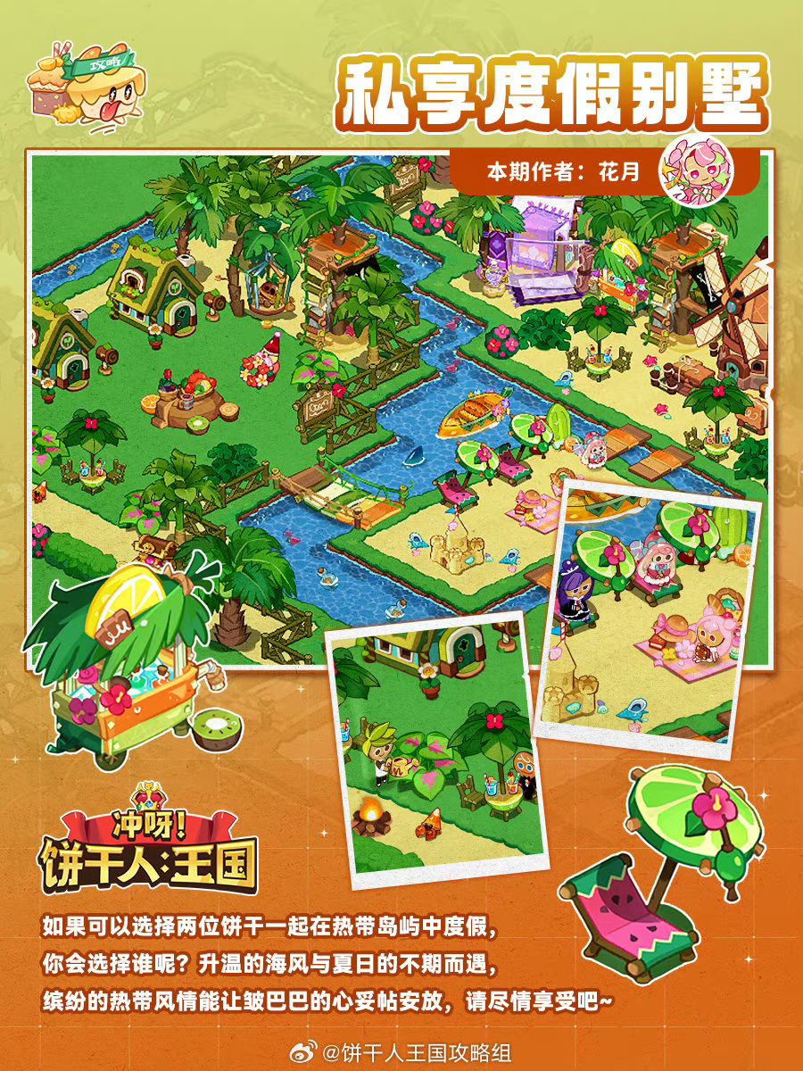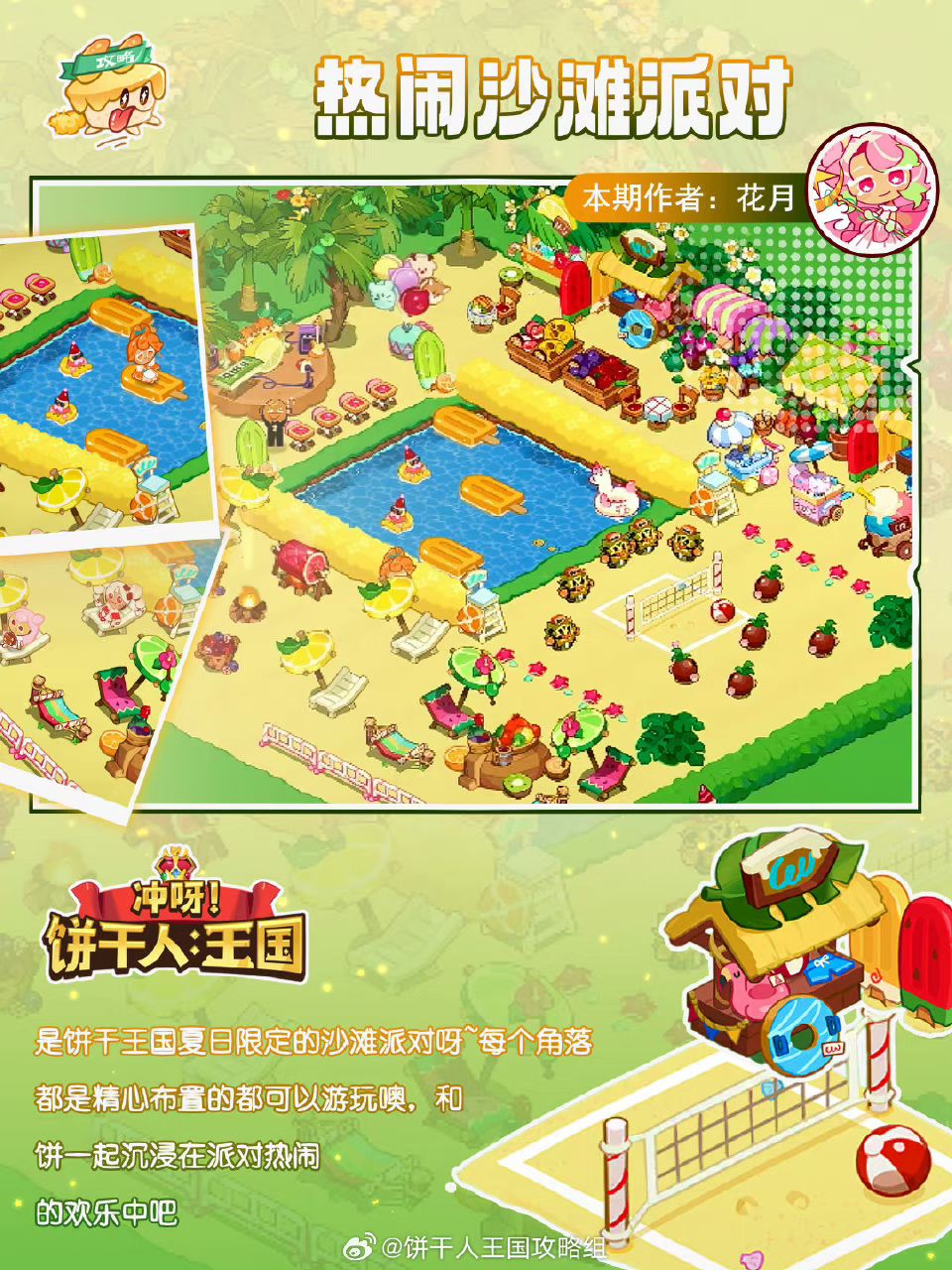是饼干王国夏日限定的沙滩派对呀~每个角落都是精心布置的都可以游玩噢,和饼一起沉浸在派对热闹的欢乐中吧 作者@花月沾衣 设计@辣鸡雨菲打羽伞