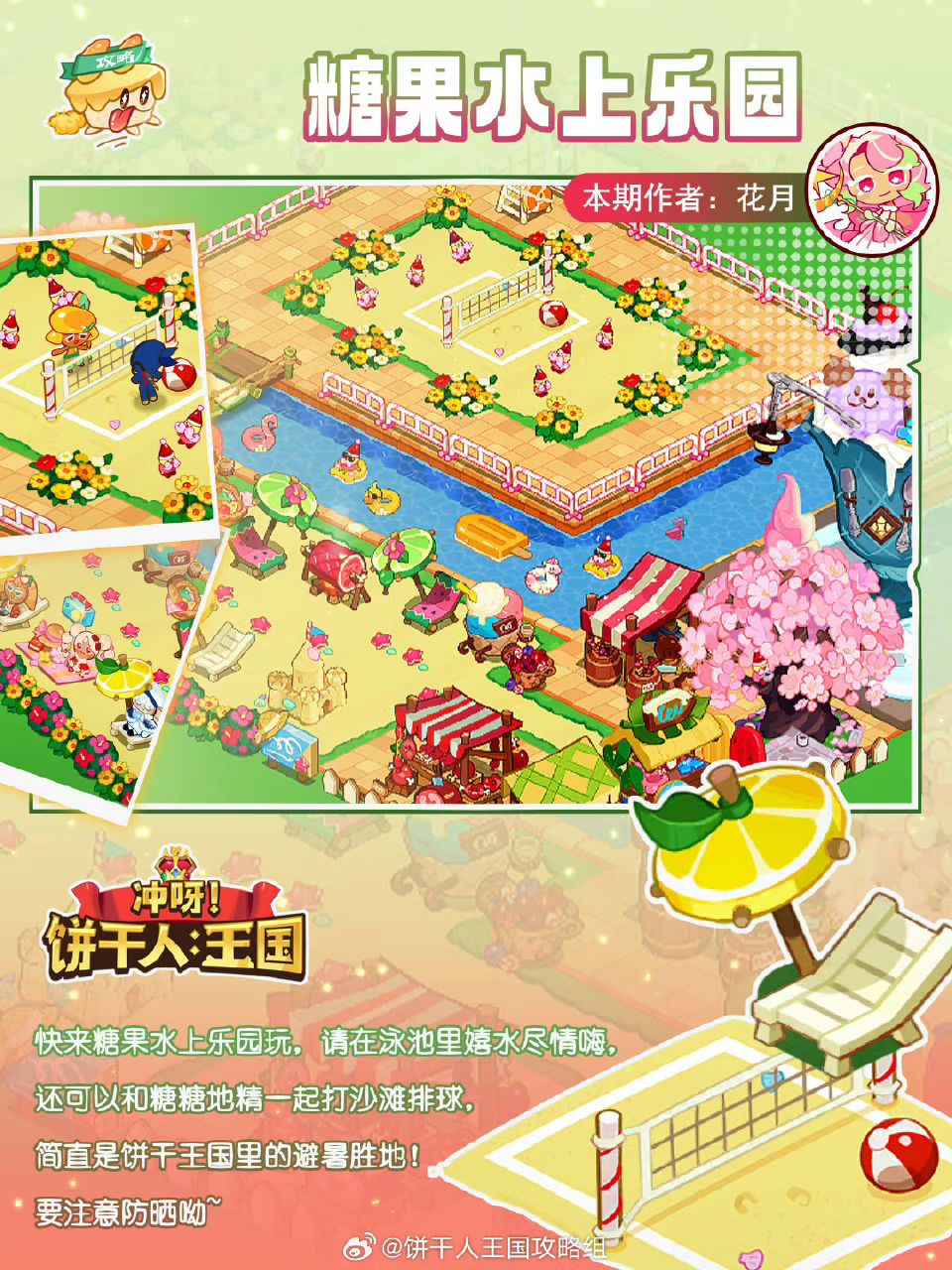 快来糖果水上乐园玩,请在泳池里嬉水尽情嗨,还可以和糖糖地精一起打沙滩排球,简直是饼干王国里的避暑胜地!要注意防晒呦~ 作者@花月沾衣 设计@辣鸡雨菲打羽伞
