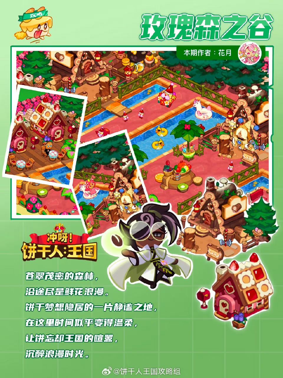 苍翠茂密的森林,沿途尽是鲜花浪漫。饼干梦想隐居的一片静谧之地,在这里时间似乎变得温柔,让饼忘却王国的喧嚣,沉醉浪漫时光 作者@花月沾衣 设计:不柿本人