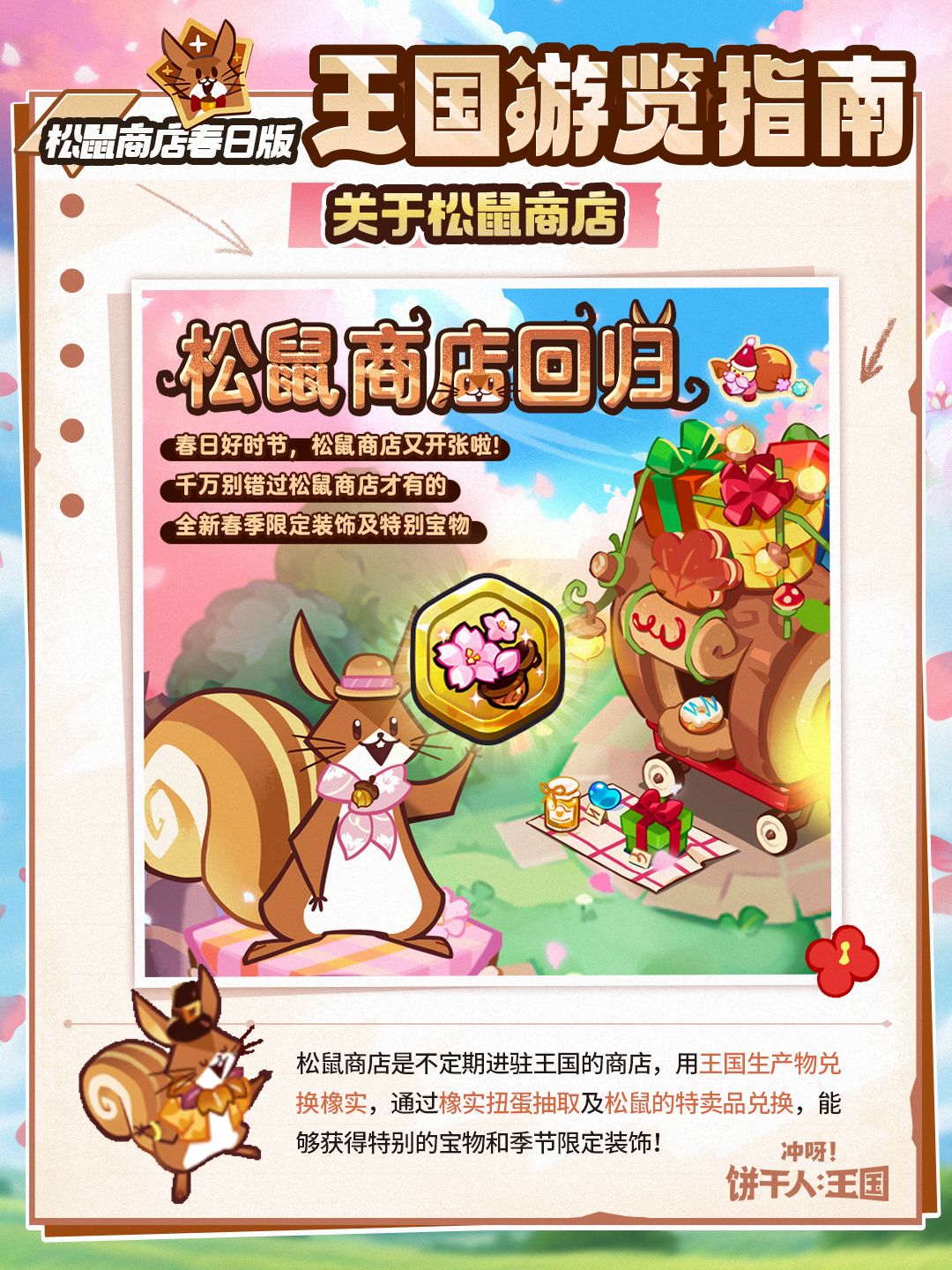 冰雪消融,嫩芽破土,松鼠商店随春天的到来又回到王国!本次商店包含期间限定装饰,和松鼠商店特供宝物,千万不要错过哦~ ✦关于松鼠商店 松鼠商店是不定期进驻王国的商店。活动期间,饼干朋友们可通过王国生产物兑换橡实,并使用橡实抽取/兑换松鼠商店的特卖品,其中包括特别的宝物和限定装饰哦~ ✦本期限定奖励 「特别宝物」樱花绽放的橡实烟火 「限定系列装饰」樱花飞舞 >>活动时间:4月4日0:00--4月16日