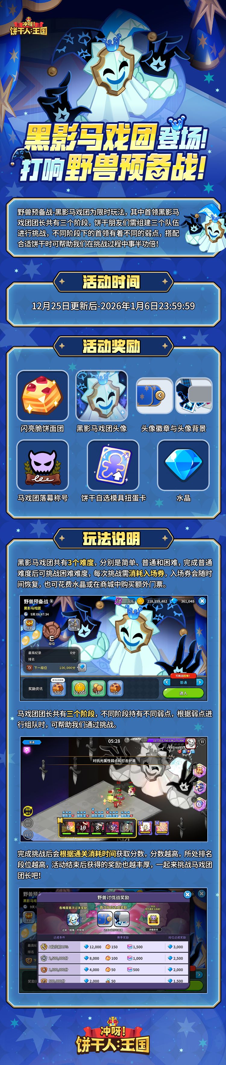 野兽预备战为限时挑战玩法,饼干朋友们需要组建三支队伍挑战强大的首领:黑影马戏团团长。首领:黑影马戏团团长共有三个不同阶段,且每个阶段的弱点各不相同,一起来迎战野兽力量的化身吧! ✦活动时间 12月25日更新后-2026年1月6日23:59:59 ✦活动奖励 闪亮脆饼面团、活动头像、头像徽章、头像背景、活动称号等