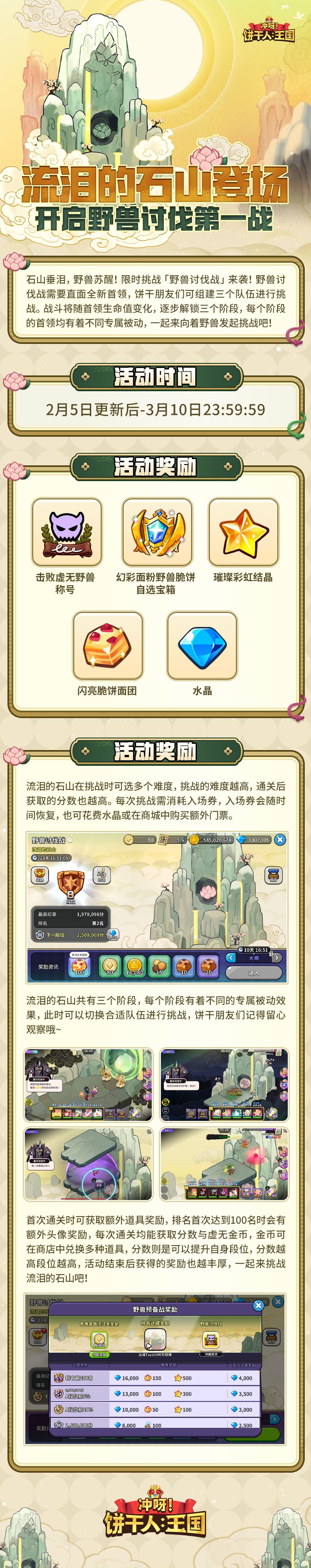野兽讨伐战-流泪的石山为全新形态强大首领,该首领共有三个阶段,会随着生命值的变化而解锁,不同阶段有着不同专属被动效果,击破野兽,解开石山的秘密吧! ✦活动时间 2月5日更新后-3月10日23:59:59 ✦活动奖励 幻彩面粉野兽脆饼自选宝箱、闪亮脆饼面团、璀璨彩虹结晶、活动称号