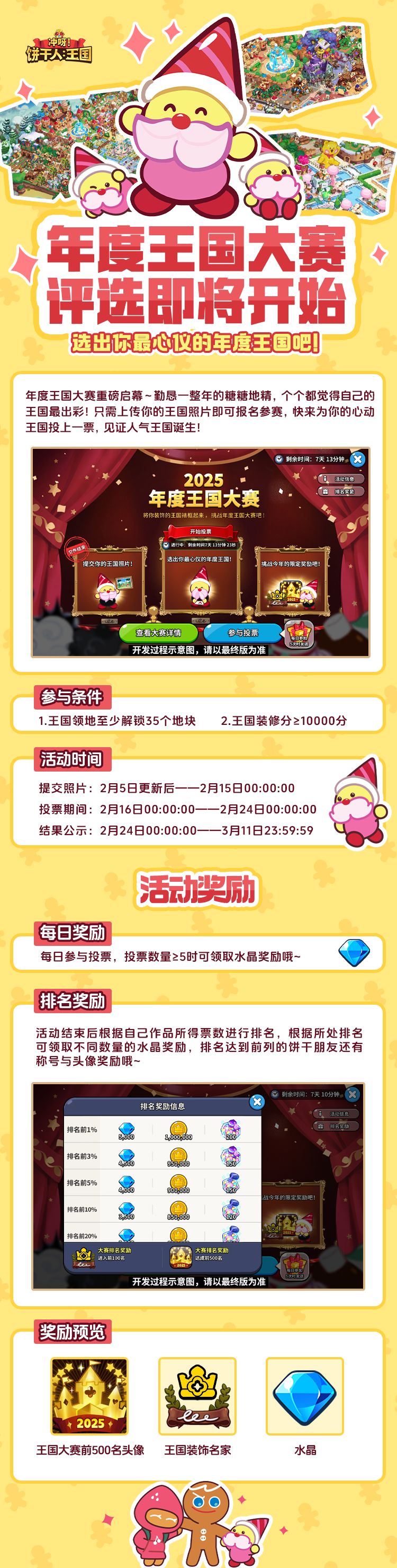 延续年度评选的热忱,再赴岁末人气之约,一同选出你心中的年度王国与年度人气饼干吧! 2月5日更新后,岁末人气饼干、年度王国评选大赛同步拉开帷幕,究竟谁能登顶年度榜单?还请为你喜爱的饼干应援呐喊,决出最终的优胜饼干吧!