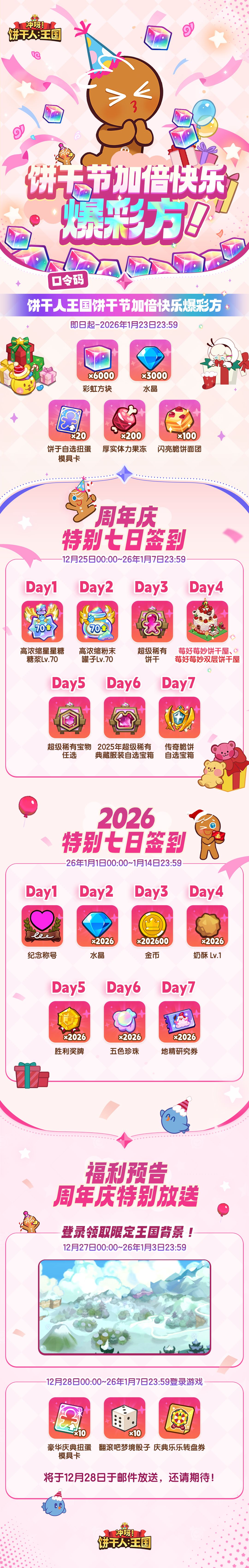 走过飞雪与愿望交织的冬夜; 回到勇敢冲出烤箱的重要日子; 迎接饼强糕壮新的一年…… 在这个重要的日子加重要的日子加重要的日子里,为各位饼干朋友准备了重要的饼干节福利! 在游戏内输入口令码「饼干人王国饼干节加倍快乐爆彩方」收获6000彩虹方块等福利,更有重磅签到福利将于明天起陆续放送,记得登录游戏,千万不要错过!