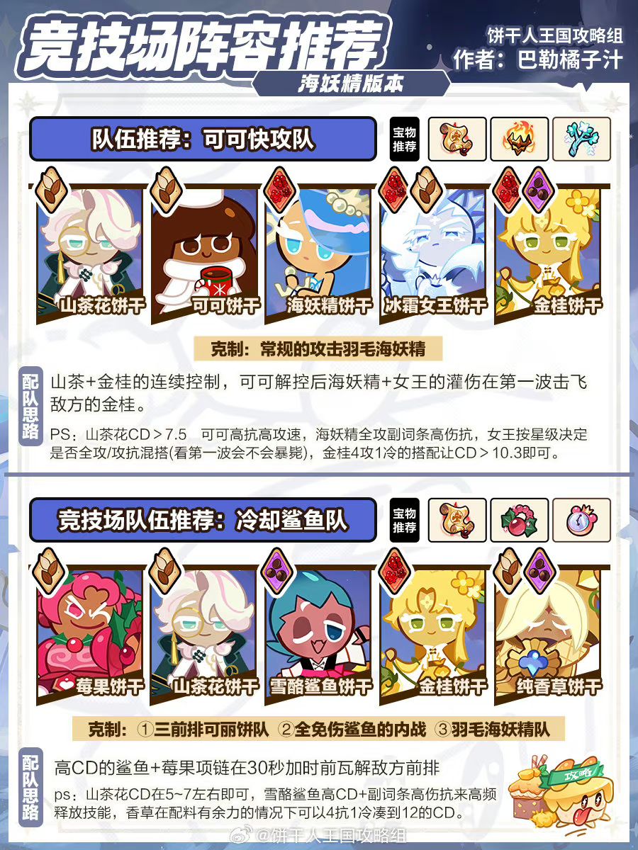冰浪版本,海妖精和鲨鱼饼干队伍推荐和配料配置推荐。 1海妖精双前排队特点分析: 海妖精技能带有控制、减防,同时还能无视部分伤害减免,伤害非常高。海妖精的击飞眩晕更加稳定,而且抬手快。 2 鲨鱼双前排队特点分析:鲨鱼的技能真实伤害可以有效克制对面的莓果和山茶花,可以称得上是打坦克一把好手了,配合自家双前排和纯香草的奶来提供强大的生存能力,还能帮金桂削对面血线,非常好用。