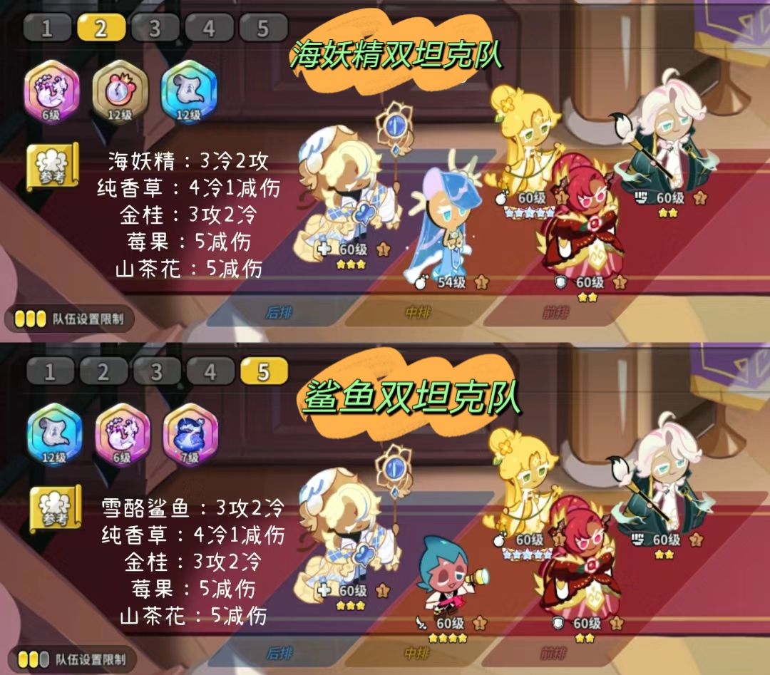 第一套阵容 前排:红丝绒+草莓可丽饼,中排蘑菇金桂,后排纯香草 宝物:树枝 火炬 闹钟 配料:红丝绒全冷却,草莓全冷却或3冷却2杏仁,蘑菇金桂全攻击,纯香草全杏仁 蘑菇克制回血,红丝绒负责切后,草莓负责保护双c加伤免buff 【适合三前排阵容练度不高的玩家使用】 第二套阵容 前排:玛德莲+草莓可丽饼、中排:金桂红丝绒、后排:纯香草 宝物:斗篷 闹钟 火炬 配料:玛德莲配料全攻速,草莓可丽饼全冷